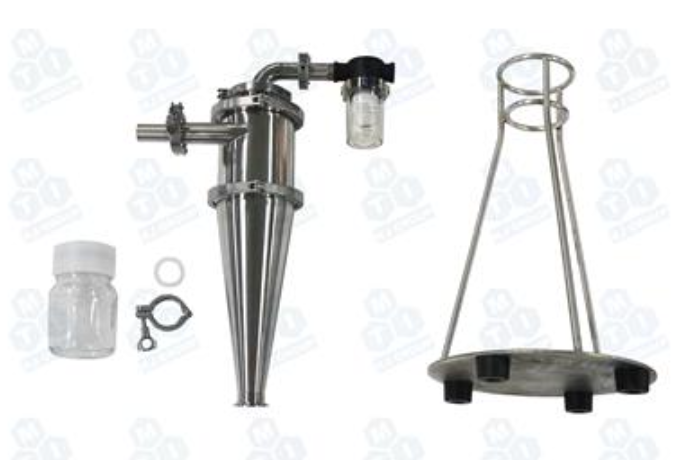 BPM-CL is a lab-scale powder cyclone used with the MTI Jet Mill and offers optimum recovery of sub-micron fines. Undersize sieve fractions are directed through an anti-static vacuum hose through the cyclone and collected in a threaded glass receiving bottle. Material contact parts are constructed of stainless steel or glass. Support stand allows for stand-alone operation, or the unit can be mounted to the base of an Air Jet Sieve.