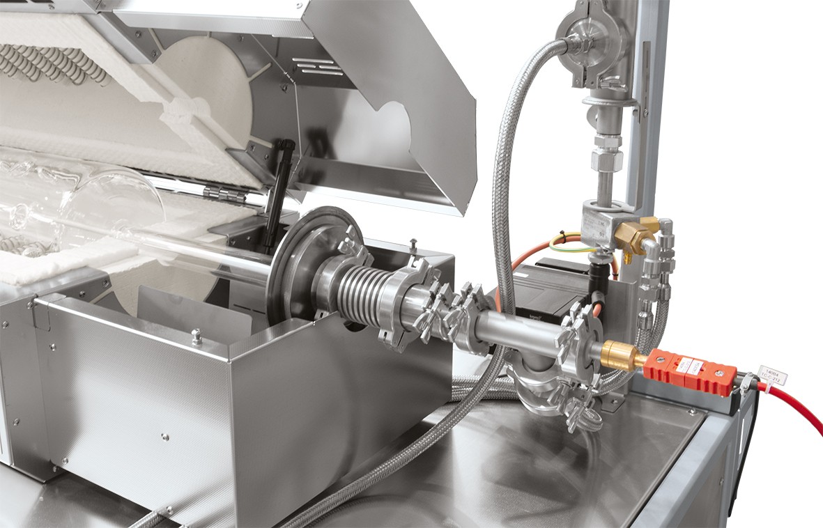 The rotary tube furnaces of the RSRB series are suited for batch operation. The rotation of the working tube ensures that the charge is in motion. Due to the shape of the quartz reactor with the tapered pipe ends the batch is kept in the rotary tube furnace and can be heat-treated an arbitrarily long time period time. A controlled heating to the temperature profiles is also possible.